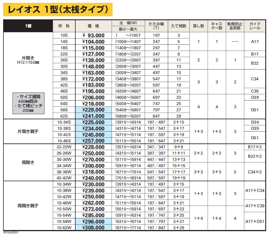 レイオス1型【太桟タイプ】 クリックで拡大画像を開きます。 名称YKK APレイオス1型【太桟タイプ】 価格93,000円~45%OFF販売価格51,150円(税別)~ 規格 【タイプ】・手動 片開きタイプ・手動 両開きタイプ※特長とカラーバリエーションは、上記の画像をクリックしてください。【カラー】グレイ / ブラウン / カームブラック / プラチナステン / ホワイト【寸法】幅:1,008〜8,314mm ※1型の場合 ※写真の商品と表示価格の商品は、サイズ・色が多少異なる場合があります。※工事費とハツリ代は別途となっております。